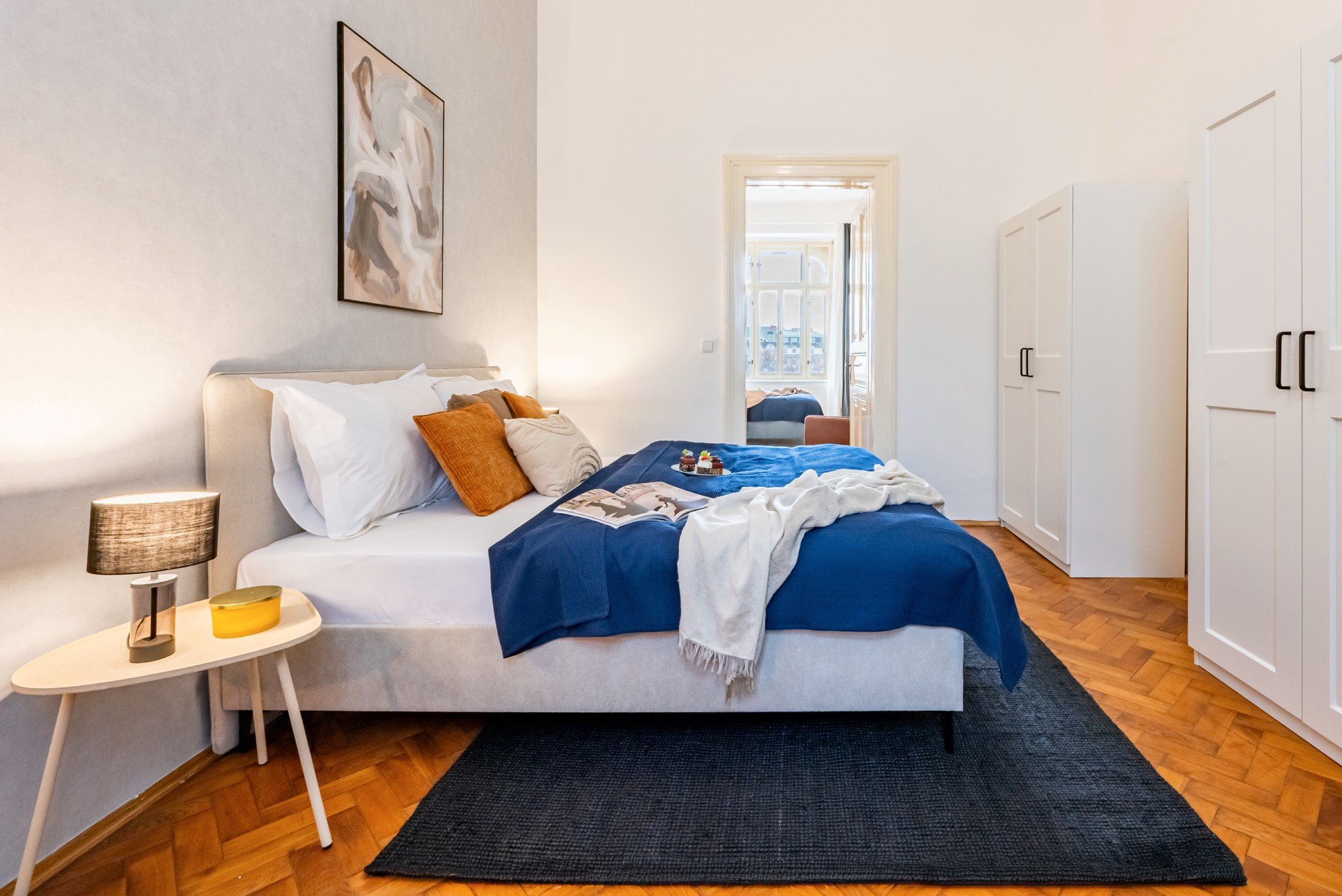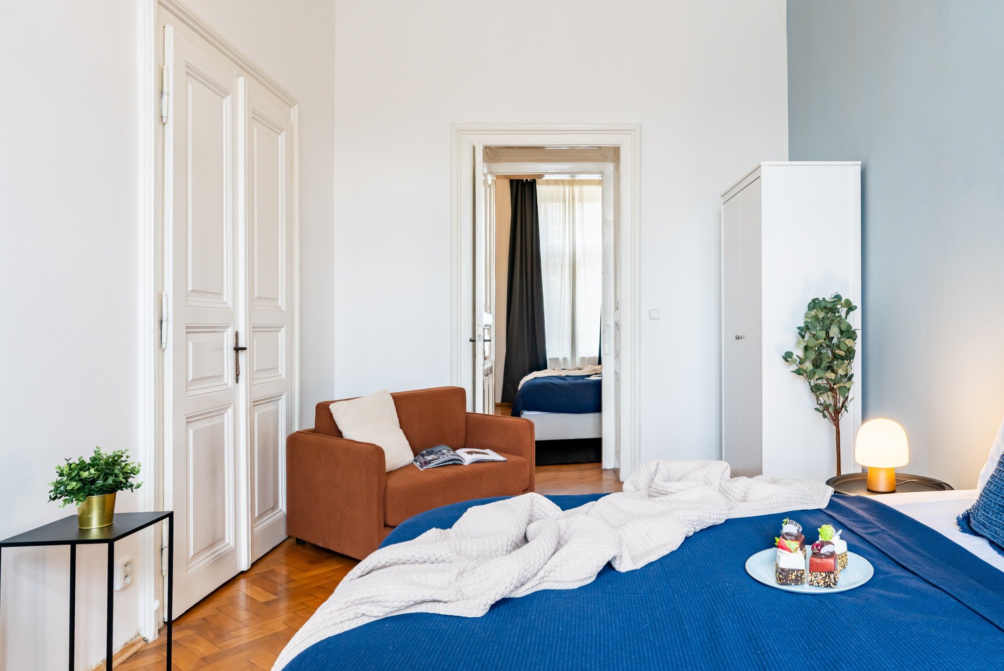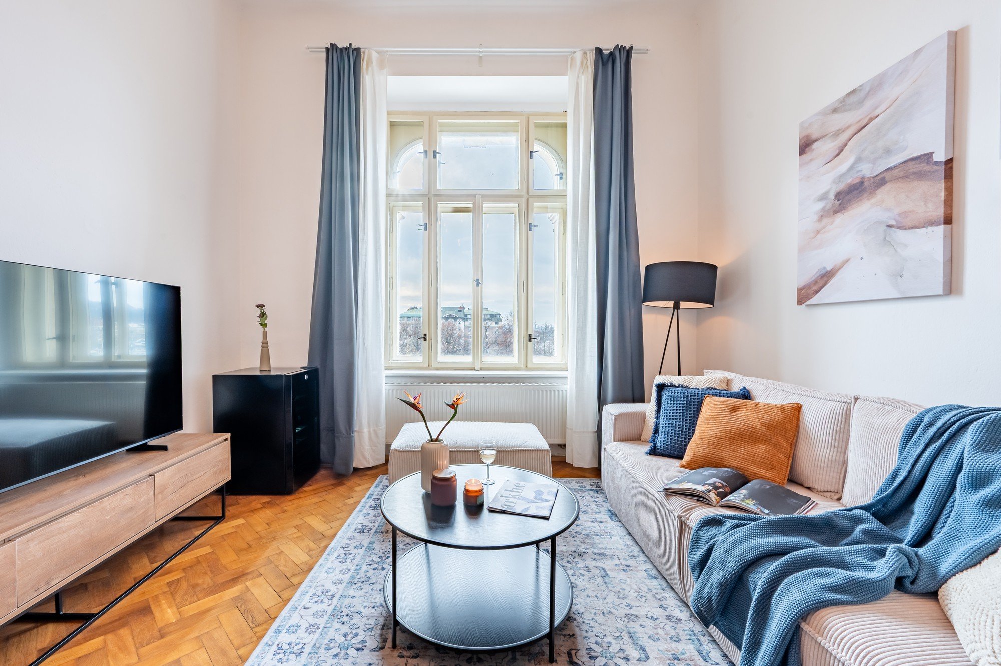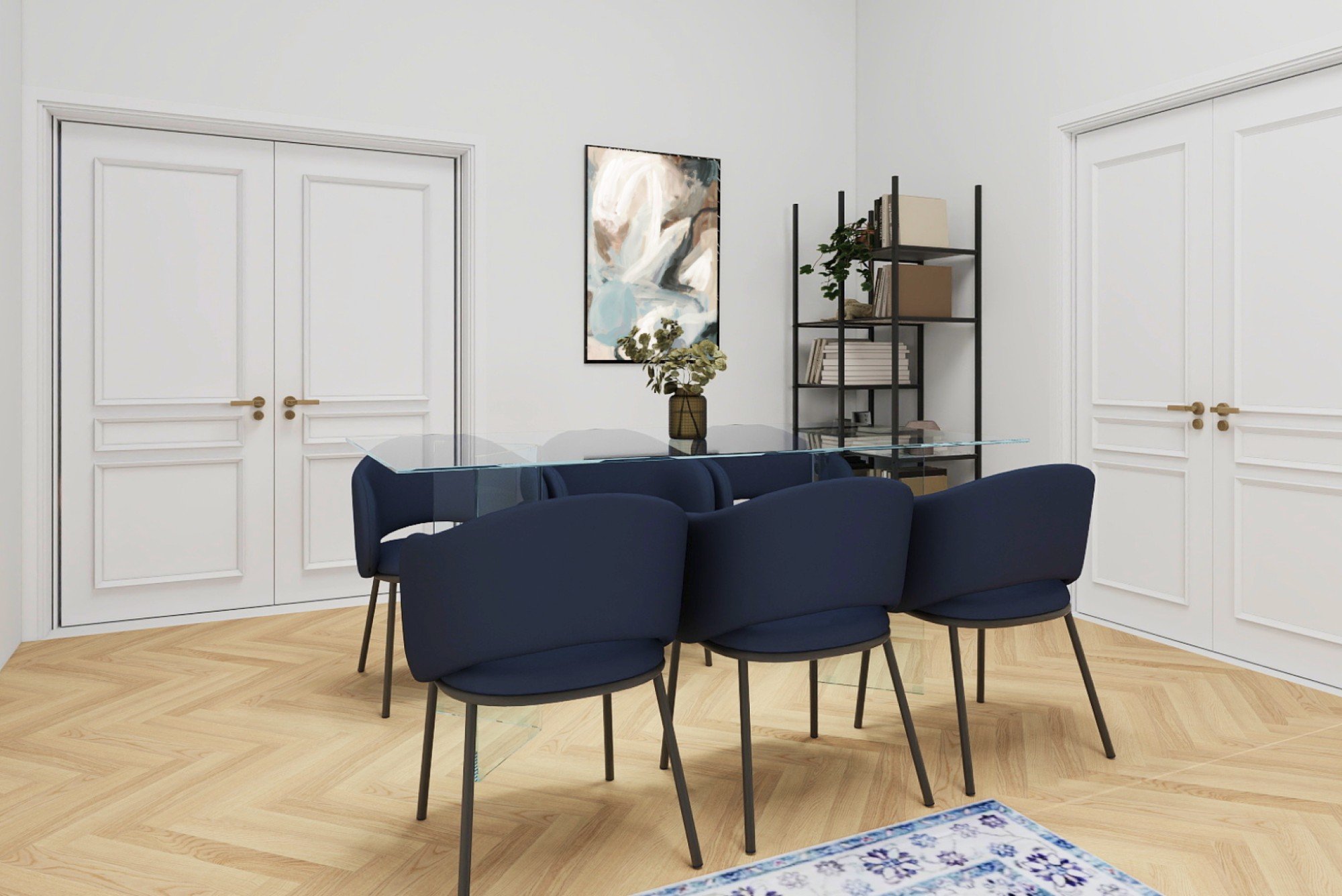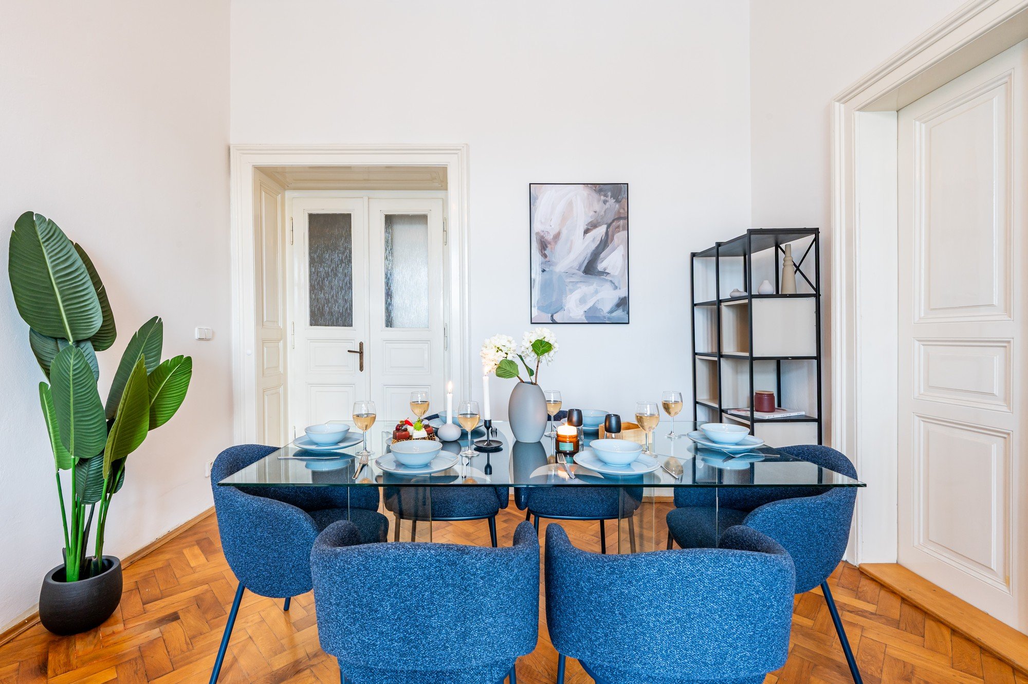Ajaloolise maja avaras korteris on ühendatud grandioossed proportsioonid läbimõeldud detailidega. Kõrged laed, originaalsed parkettpõrandad ja tumeda puidu kontrast pehmete siniste toonidega loovad ajatu interjööri, mis on rahulik, elegantne ja loomulikult hubane. Igapäevaelu ja seltskondlike hetkede jaoks loodud planeering tõestab, et mugavus ja iseloom käivad käsikäes.