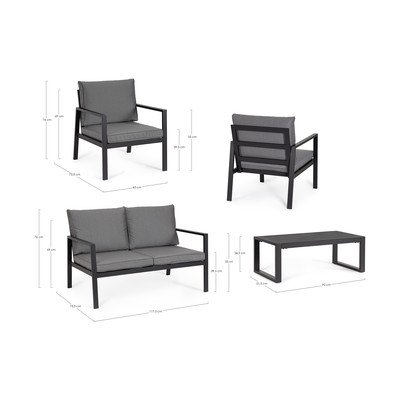 Diivani mõõtmed on 117,5 x 73,5 x 76 cm, istme kõrgus 39,5 cm ja käetugede kõrgus 55 cm. Iga tugitooli mõõtmed on 63 x 73,5 x 76 cm, istme kõrgus 39,5 cm ja käetugede kõrgus 55 cm.