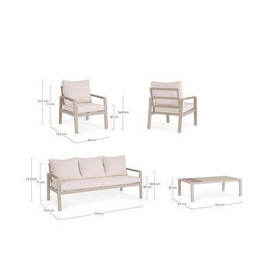 Bizzotto Elna aiamööbli komplekt pakub terviklikku lahendust õues istumiseks. Komplekti kuulub diivan, kaks tugitooli ja diivanilaud, mis kokku pakuvad ruumi viiele inimesele. Kogu komplekti konstruktsioon on valmistatud alumiiniumist, mida täiendab mugavuse tagamiseks pehme polsterdus.