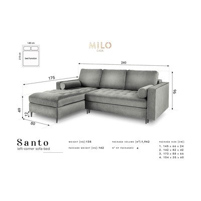 Sametpinnaga nurgadiivan Milo Casa Santo annab suurepärase puhkeala kogu perele ja lisab interjöörile luksust. Selle brändi poolt kasutatavad kangad on läbinud rangeid teste, et tagada kõrge vastupidavus, mugavus ja atraktiivne stiil. Seega on selle diivani katmiseks kasutatud ilusat, kergelt läikivat ja lühikese vaibaga kangast, mis on väga meeldiva puudutusega ja ka väga vastupidav kulumiskindel. Kanga puhul kasutatud Liquid Blocked-tehnika raskendab vedelike imendumist, mistõttu vedelik koguneb materjali pinnale, tungimata sügavale kiudududesse. Selle tulemusel eemaldatakse kangale valatud kohv, tee või vein sekunditega, kasutades selleks kergelt imavat lappi või paberrätikut.