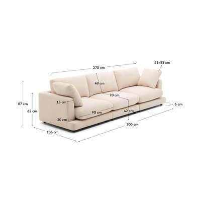 Kave Home Gala diivan on mööbliese, mis ühendab teie elutoas disaini, mugavuse ja kvaliteedi. Selle ümarad vormid ja avarad mõõtmed loovad hubase atmosfääri, mis sobib ideaalselt eriliste hetkede nautimiseks pere või sõpradega. Kvaliteetsest šenillkangast polster, millel on peen struktuur ja mis on valmistatud polüestrist ja puuvillast, on pehme ja meeldiv puudutus, tagades samal ajal märkimisväärse vastupidavuse ja vastupidavuse. Kangas on plekikindlalt töödeldud, mis võimaldab seda puhastada niiske lapiga. Istmete ja seljatugede eemaldatavad katted on masinpestavad. Kanga tarnija on OEKO-TEX® STANDARD 100 sertifikaadiga, mis tagab keskkonnasõbraliku ja vastutustundliku tootmise. Istme täidis on valmistatud 100% pehmest silikoonitud kiust, mis pakub väga sulelist tunnet. Vahtsüdamik tihedusega 30 kg/m³ on mõlemalt poolt mähitud kiuga, mis võimaldab istmeid pöörata. Padjakatted on eemaldatavad ja pööratavad. Sisemine konstruktsioon on valmistatud FSC Mix Credit sertifitseeritud männipuidust, mis tähendab, et see on valmistatud FSC sertifitseeritud metsade ja kontrollitud puidu materjalide segust. Euroopas valmistatud Gala diivan peegeldab kvaliteeti ja hoolivust igas detailis.
