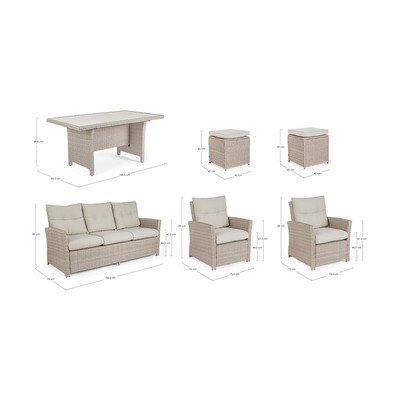 Bizzotto hall kunstlikust rotangist aiamööbli komplekt Ariel on ideaalne valik pere ja sõpradega õues istumiseks. Komplekt koosneb diivanist, kahest tugitoolist, kahest taburetist ja lauast. Moodne hall rotangist välimus sobib ideaalselt nii terrassile kui ka aeda. Arieli komplekt pakub piisavalt ruumi mugavaks istumiseks kuni kuuele inimesele. Diivani mõõtmed on 186,5x76x89cm, tugitoolide mõõtmed 145,5x85,5x69,5cm ja taburettide mõõtmed 42x42x40cm. Laud, mille mõõtmed on 76x75,5x89cm, pakub palju ruumi suupistete ja jookide jaoks.