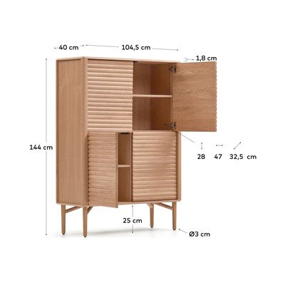 Selle neljal uksel on huvitav horisontaalne reljeefmuster ja praktiline vajutamisega avamise süsteem. Kogu mööbliese seisab peenel puidust alusel, mis rõhutab selle modernset esteetikat.