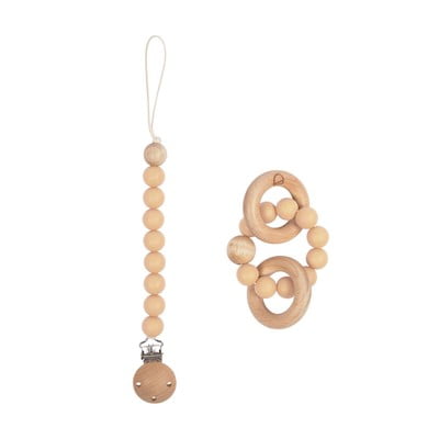 Kave Home Epiphany lutiklamber on praktiline aksessuaar igale beebile. Komplekt sisaldab lutiketti ja närimisrõngast, mõlemad valmistatud naturaalsest puidust. Minimalistlik disain ja looduslikud materjalid tagavad nii ohutuse kui ka stiili. Klamber hoiab luti alati käepärast, samas kui närimisrõngas aitab hammaste tulekul.