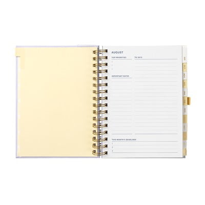 Päevik hõlmab 13 kuud augustist järgmise aasta augustini. See võimaldab iganädalast ja igakuist planeerimist. Praktilised jaoturid muudavad aasta jooksul navigeerimise lihtsaks. Tagaküljel olev tasku hoiab tähtsad märkmed või visiitkaardid koos, et Sa neid enam ei kaotaks.