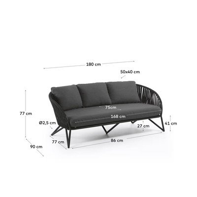 Nautige lõõgastumist kaetud õuealal koos Kave Home'i diivaniga Branzie. See on valmistatud käsitsi kootud nöörist, mis on UV-kindel. Punutud nööri täiendab metallkonstruktsioon, mis on tsingitud. Padjad on veekindlad ja neil on eemaldatav kate.