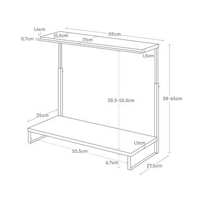 Kandevõime poolest talub ülemine riiul kuni 2 kg ja alumise riiuli maksimaalne koormus 10 kg. Aluse kogumõõtmed on 38–65 x 59 x 27,5 cm (kõrgus x laius x sügavus).