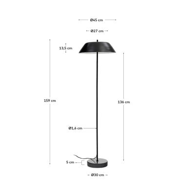 Kave Home Sayra põrandalamp toob teie interjööri minimalistlikku elegantsi. Lamp on 153 cm kõrge ja koosneb mustast metallist varjust, mis on kinnitatud peenele vardale. Lambile annab stabiilsuse mustast marmorist ümar alus, mis muudab iga eseme originaalseks, ainulaadse mustri ja tekstuuriga. Sayra lamp ühildub E27 tüüpi pirnidega, mille maksimaalne võimsus on 40 W. Pirn ei kuulu komplekti.