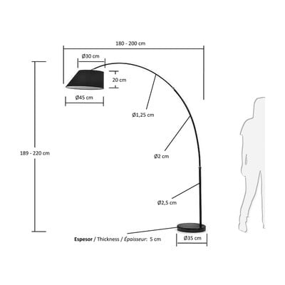 Mustas tekstiilist kupliga põrandalambis on ühendatud elegants ja funktsionaalsus. Selle reguleeritava kõrgusega metalljalg 189 kuni 220 cm ja 180 kuni 200 cm laiune pöörlev varras võimaldavad ruumi paindlikku valgustamist. Metallkonstruktsiooni ja puuvillase kupli must viimistlus loob ühtse, stiilse välimuse.
