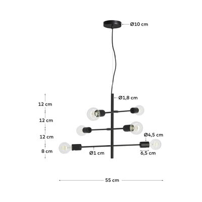 Kave Home kaubamärgi must Spica rippvalgusti läbimõõduga 55 cm avaldab muljet oma moodsa disainiga, millest saab teie elutoa domineeriv element. Lamp on valmistatud metallist ja selle ainulaadne stiil võimaldab kuuel pirnil silma paista, saades üldise disaini lahutamatuks osaks.