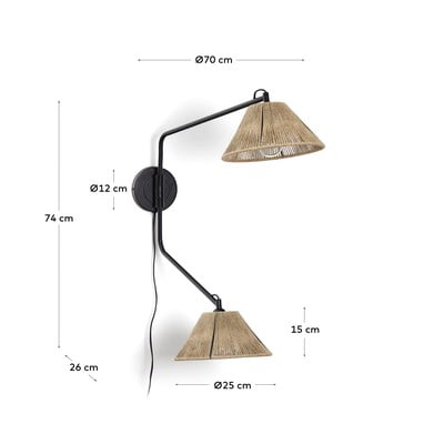Kave Home Pontos seinalamp toob interjööri looduslikke elemente. Lamp on valmistatud naturaalsest džuudist ja seda täiendab must metallkonstruktsioon. Iga ese on originaalne, käsitsi valmistatud traditsioonilisi käsitöötehnikaid kasutades, ainulaadsete toonide ja tekstuuridega.