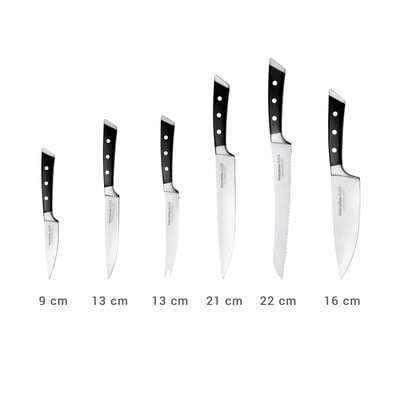 Azza noad on sepistatud Jaapani roostevabast terasest, mis annab terale vastupidavuse ja teravuse. Massiivsete neetidega ergonoomiliselt kujundatud käepide tagab mugava käsitsemise. Kogu komplekti täiendab turvaliseks ja mugavaks hoiustamiseks mõeldud plokk.
