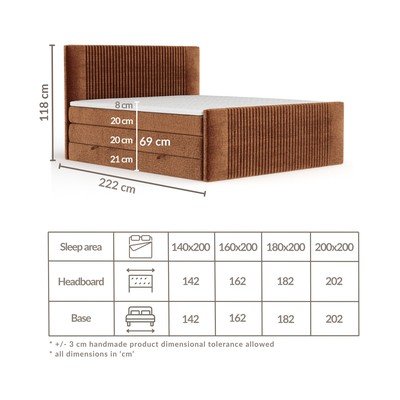 Maison de Rêve Bergamo vedruvoodi avaldab muljet oma elegantse välimusega, mis rõhutab peatsit ja alust arvukate vertikaalsete õmblustega. Tänu sellele näeb see välja moodne ja stiilne. Lisaks mugavusele pakub voodi ka praktilist hoiuruumi, mis aitab teil oma magamistuba korras hoida. Tugev konstruktsioon ja 240 kg kandevõime tagavad voodi vastupidavuse ja tugevuse. Voodi on varustatud kaheinimese madratsiga. Alumine alusmadrats on valmistatud bonell-vedrudest ja T-25 vahust. Lahtine pealismadrats on esmaklassiline, koosneb eraldi taskutesse paigutatud taskuvedrudest ja selle pind on kaetud libisemisvastase viimistlusega. Samuti on sellel kahepoolne Visco termoelastne vahust pealismadrats, millel on eemaldatav kate, mida saab pesta kuni 40⁰C juures. 8 cm kõrgune pealismadrats pakub erakordset mugavust ja kaitseb madratsit mustuse eest. Konstruktsioonis kasutatud puitdetailid on FSC-sertifikaadiga ja kogu toode on käsitööna valmistatud kogenud käsitööliste poolt EL-is. Hea teada: Toote käsitöö olemuse ja polsterduskangaste eripära tõttu on antud mõõtmed +/- 3 cm.