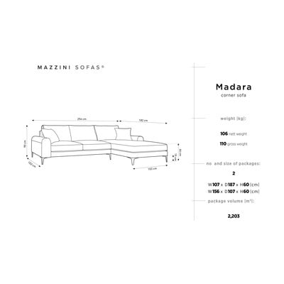 Mazzini diivanid Madara on sametist nurgadiivan, mis lisab teie elutuppa kaasaegset stiili ja mugavust. Diivaniga on kaasas ka 2 dekoratiivpatja. Selle luksuslik, peene läikega sametpolster on ideaalne valik elegantsesse interjööri. Samal ajal on see materjal pehme ja siidise puudutusega. Samuti on diivanil väga hea kulumiskindlus, mis vähendab oluliselt kahjustuste ohtu.