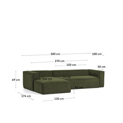 Kave Home Blok diivan on nurgadiivan, mis avaldab muljet oma laiade proportsioonide ja struktureeritud joontega. See ühendab elegantsi ja funktsionaalsuse, et integreeruda loomulikult kaasaegsesse interjööri.