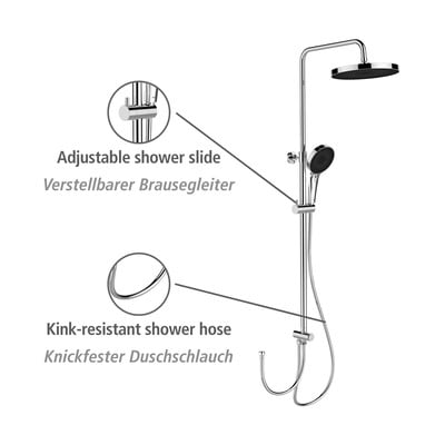 Vihmapea on varustatud kokku 416 integreeritud pihustiga, mis pihustavad vett õrnalt üle naha. Käsidušši pea 324 pihustiga pakub kokku 3 veejoa funktsiooni - vihma-, massaaži- ja intensiivseade. Seda täiendab 150 cm pikkune voolik, mis on väändumis- ja paindumiskindel.