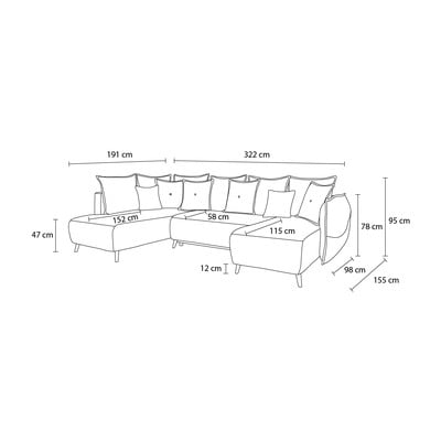 Kokkupandav/panipaigaga"U" kujuTürkiissinineMuuLaius 322 cmSügavus 191 cmIstme sügavus 58 cm