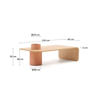 Kave Home Olaria diivanilaud ühendab originaalsel viisil puidu ja terrakotta loomuliku ilu. Ümar laud mõõtmetega 110 x 60 cm on valmistatud saarepuidu spoonist ja sellel on originaalne terrakotta ava, mida saab kasutada näiteks lillepotina.