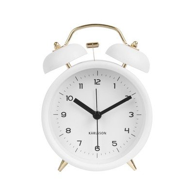 Klassikaline äratuskella kuju, vaikne mehhanism, soe valge värvus.