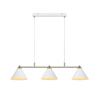 See elegantne ese koosneb põikselisele metallkonstruktsioonile asetatud lambid, millel on varjud. Kolm valguspunkti muudavad teie ruumi täiuslikult valgustatud. Kolmelambiline rippvalgusti sobib suurepäraselt näiteks söögilaua kohale.
