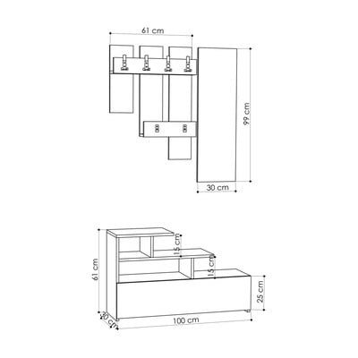 See esikusse kuuluv komplekt koosneb kingahoidjast (100 x 61 x 30 cm), peeglist (30 x 99 cm) ja 61 cm laiusest seinahoidjast.