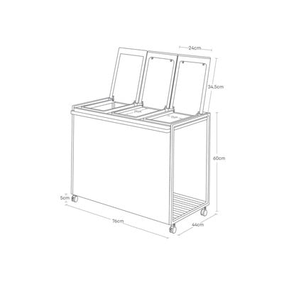 Kaheosaline prügikast on praktiline abimees jäätmete sorteerimisel. See on varustatud ratastega, millel on käepidemed, et seda oleks lihtne käsitseda. Metallkonstruktsioonil on plastist hingedega kaaned, millel on raam kahe koti riputamiseks ja eesmine täisosa jäätmete varjamiseks. Alumist riiulit saate kasutada varukottide hoidmiseks ja nende käeulatuses hoidmiseks.